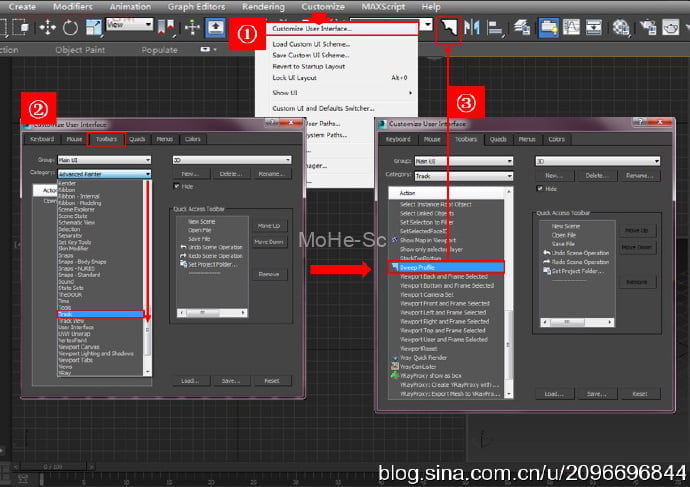 2.自动弹出了用户自定义界面(Customize User Interface),点击工具栏(Toolbars),在类别找到Track,将Sweep profile拖出到工具栏,记住是拖出来停靠在工具栏噢,当我们看到踢脚线图标停靠在工具栏时,我们就可以开始使用了。