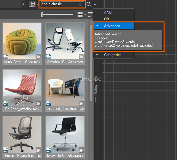 该插件还能够在Search => Advanced mode中使用“-”符号从搜索中排除单词,从而增强了搜索功能。例如,使用单词“chair-classic”搜索所有名称中包含单词“chair”的模型,并排除所有包含单词“classic”的模型。