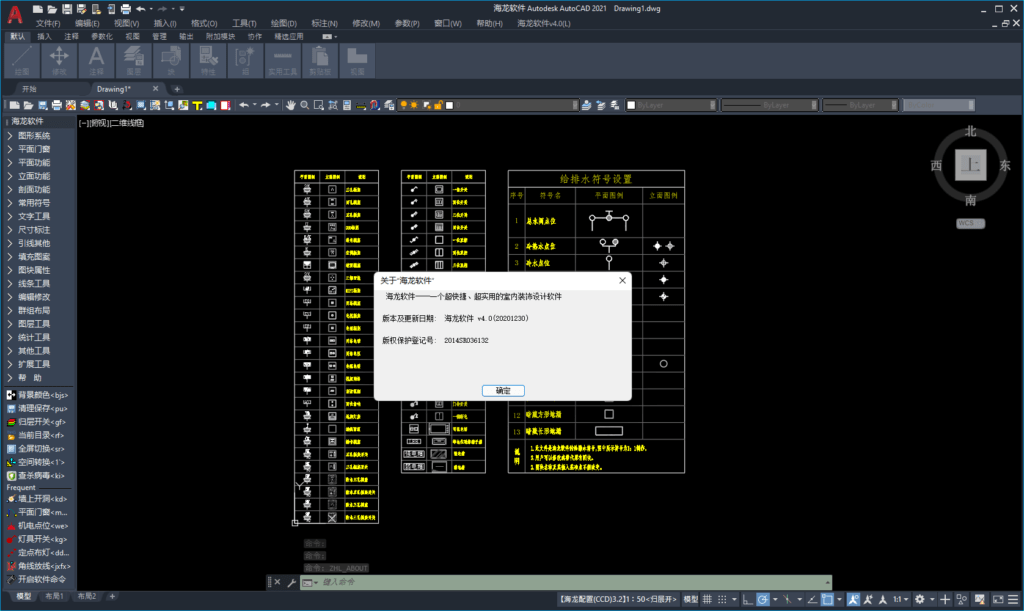 用户将“自己或公司制图规范”配置入海龙工具后, 绘制出来施工图的图层,图例,线性,材料编号,文字,标注及颜色等就是自己的标准。严格上讲,这就相当于是海龙为你量身制图规范的一款软件,无论何时何地,你都能输入YY启用你的规范制图旅程。