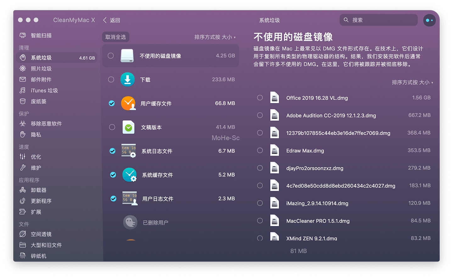 CleanMyMac X 中文破解版只需两个简单步骤就可以把系统里那些乱七八糟的无用文件统统清理掉,节省宝贵的磁盘空间。cleanmymac x个人认为X代表界面上的最大升级,功能方面有更多增加,与最新macOS系统更加兼容,流畅地与系统性能更加结合,静默清理、记录更新、清洁缓存、快速和安全删除、卸载应用程序和清空回收站等重要功能。