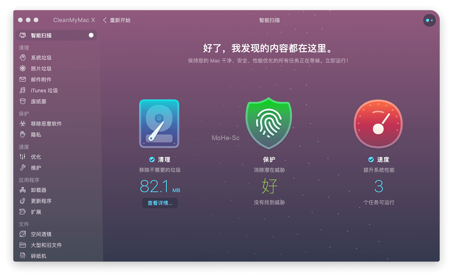 一键智能化清理是对您的Mac进行一站式清理,自动扫描Mac上的所有文件, 包括:Mac系统清理、邮件应用程序清理、大&旧型文件清理、 itunes文件清理、废纸篓清理等,人们只需要操作三个步骤:打开CleanMyMac—扫描—清理,完成mac智能化清理!