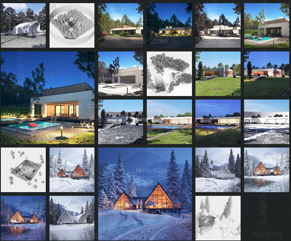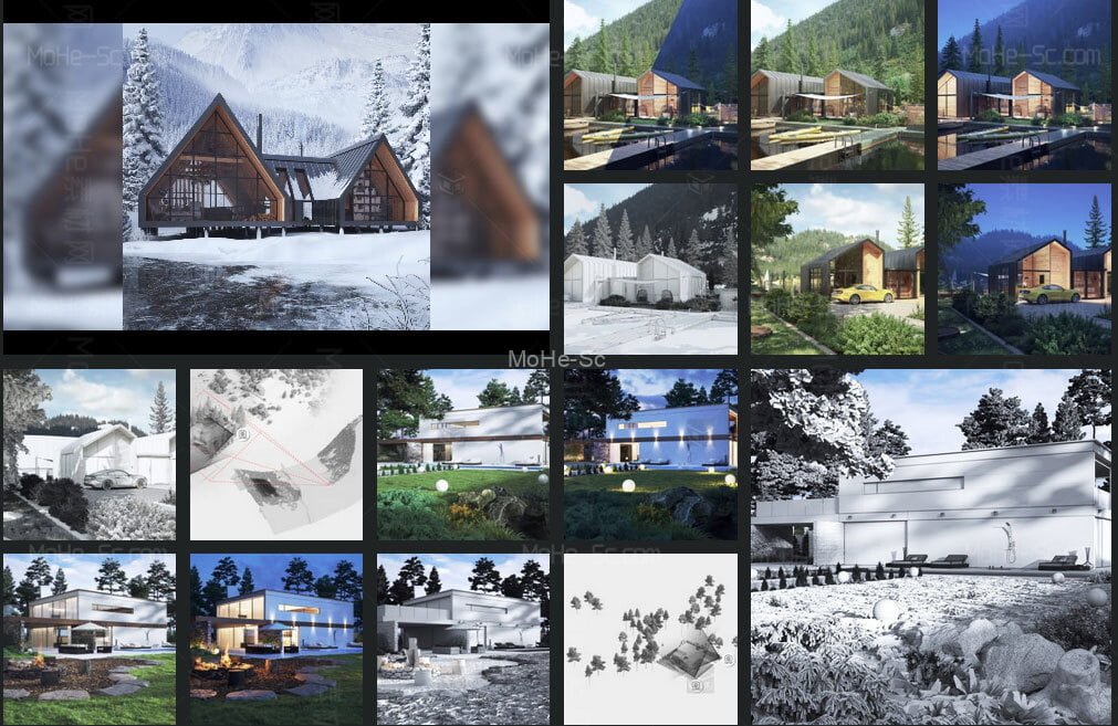 Archexteriors vol. 39包括10个郊区房屋及其周围环境的完全纹理化的外部场景。有许多高质量的植物模型和精确设置的灯光在每一个场景。每种外观都有两种版本——白天和夜晚照明。