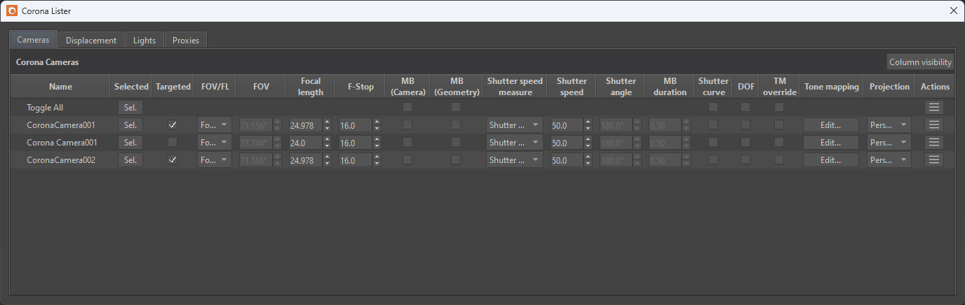 Corona Lister 现在允许您查看和调整场景中的所有灯光(灯光、灯光材质和太阳)、代理、位移材质和相机(以及在 3ds Max 中,还有位移修改器)。在 3ds Max 中,单独的 Scatter Lister 也经过了彻底重新设计,而在 Cinema 4D 中,Scatter Lister 已添加到主 Lister 中。这使您可以更轻松地查找和调整场景中的所有这些元素。