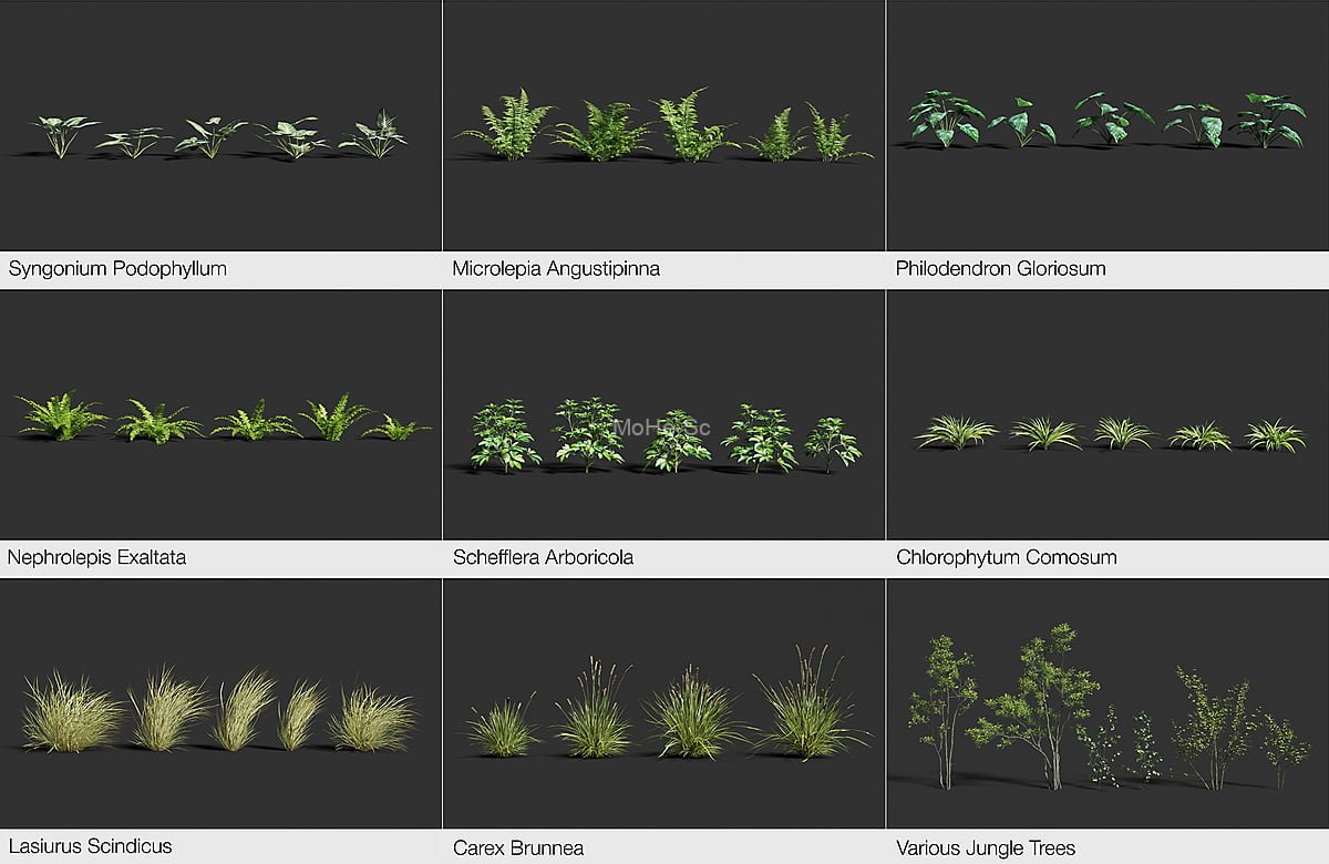 包含树木和花草两个预设包,植物都是包含风吹动真实动画效果,通过TerraScape插件调用(已包含),动画的强弱、方向、模型大小位置等都可以调节,写了插件的图文安装步骤