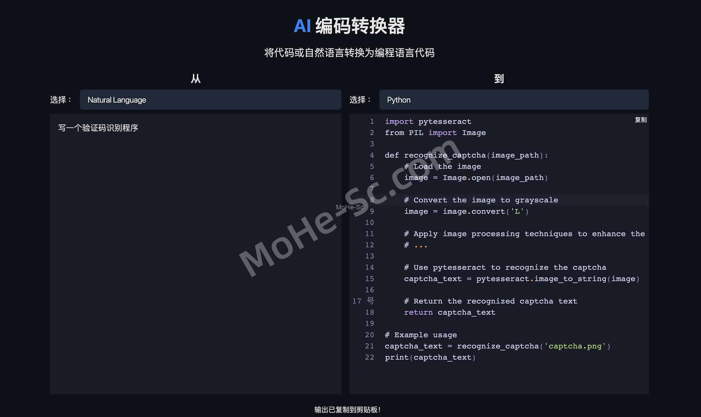 AI Code Converter(人工智能代码翻译器)是一个AI代码翻译器,使用AI将代码或自然语言转换为编程语言代码,也就是说,可以将自然语言翻译成任何一种编程语言,或者将一门编程语言转换成另一种编程语言,不用代码编程知识的小白也可以写代称程序了,而且还是一个免费的工具。