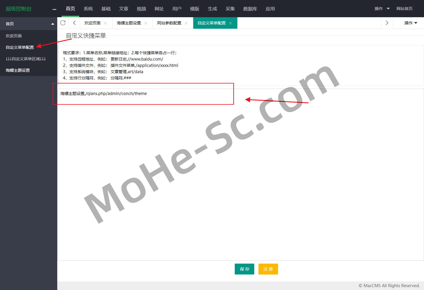 第六步:登录网站后台—–自定义菜单配置里面添加:海螺主题设置,/admin.php/admin/conch/theme